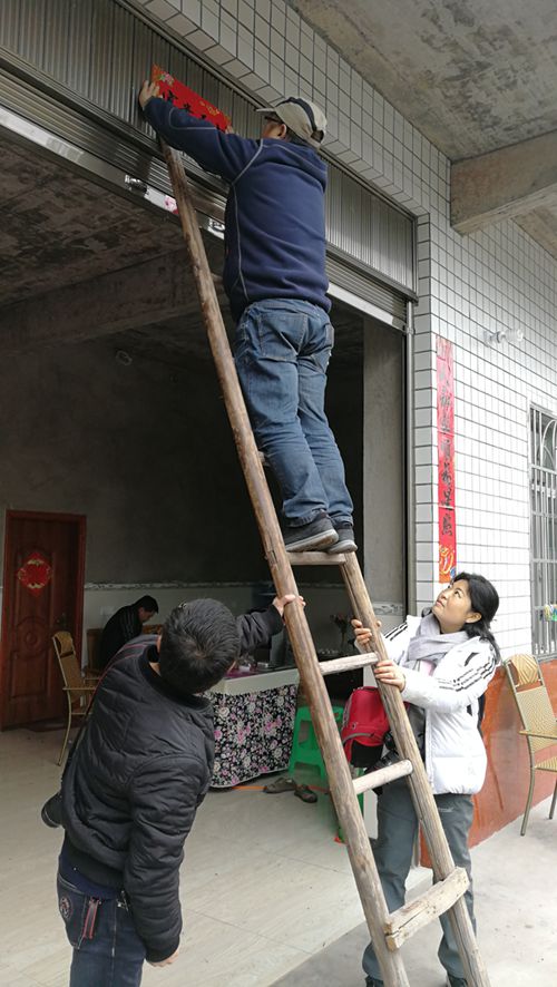 送年货、挂福字、贴春联、拍照片(全家福),是这次扶贫行动的主题。一大早,协会志愿者们驱车,陆续赶赴五星镇,分别前往赶场坝村、白玉村、长久村三个村的五户贫困家庭家里进行了慰问。送去米和油,从物资上给予贫困家庭新春慰问;大家亲手为贫困家庭贴上春联、挂上福字,从氛围上给他们的春节增添一份喜庆的色彩;这次行动的主要任务就是发挥协会特长给这些家庭都拍摄了“全家福”相片。协会出发前考虑周到,把电脑、打印机、相纸、相框都带上,做到了现场即拍(拍摄照片)、即编(编辑照片)、即印(照片打印)、即装(照片装框)、即送(即送照片),一幅幅喜气洋洋的“全家福”,即时捧在了群众手中,摆在了他们的桌柜上。